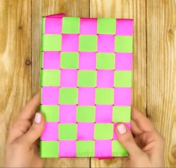 Bännercher vun enger Faarf (gréng) horizontal, bannen am Buch Deckel pechen an di aner Faarf (rosa) vertikal pechen.